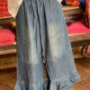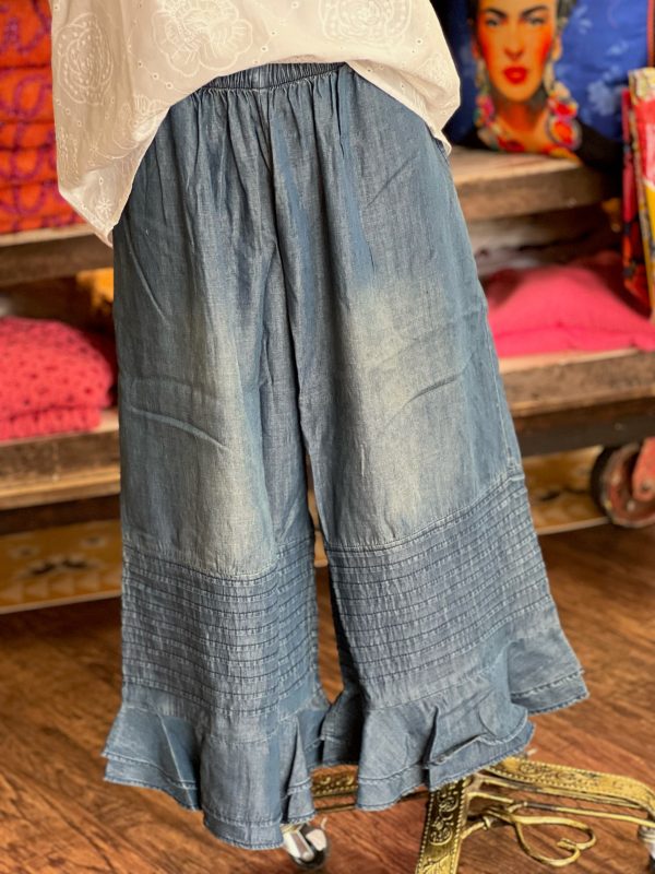 Wide leg pant with pleating designs and ruffle trim at bottom. 100% Cotton. True to size.