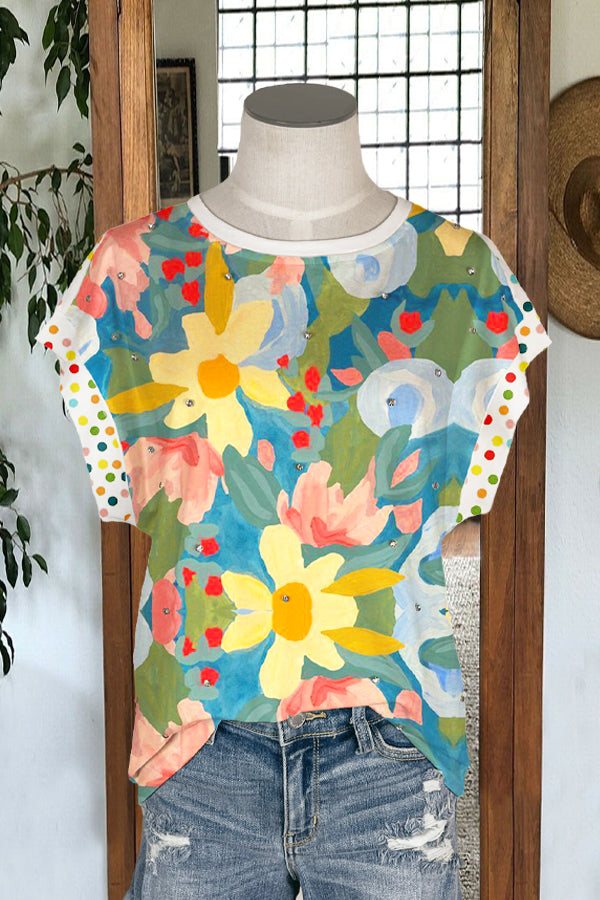 Elegant Flower Print Stitching Diamond Round Neck T-shirt Top